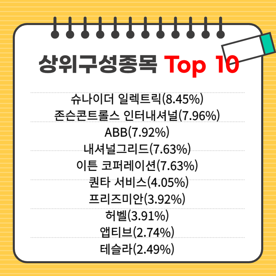 GRID는 전력 인프라 혁신을 선도하는 기업들로 주된 포트폴리오를 구성하고 있습니다. 상위 구성종목 10개만 알아보면 슈나이더 일렉트릭(8.45%), 존슨콘트롤스 인터내셔널(7.96%), ABB(7.92%), 내셔널그리드(7.63%), 이튼 코퍼레이션(7.63%), 퀀타 서비스(4.05%), 프리즈미안(3.92%), 허벨(3.91%), 앱티브(2.74%), 테슬라(2.49%) 등의 종목으로 구성되어 있습니다.