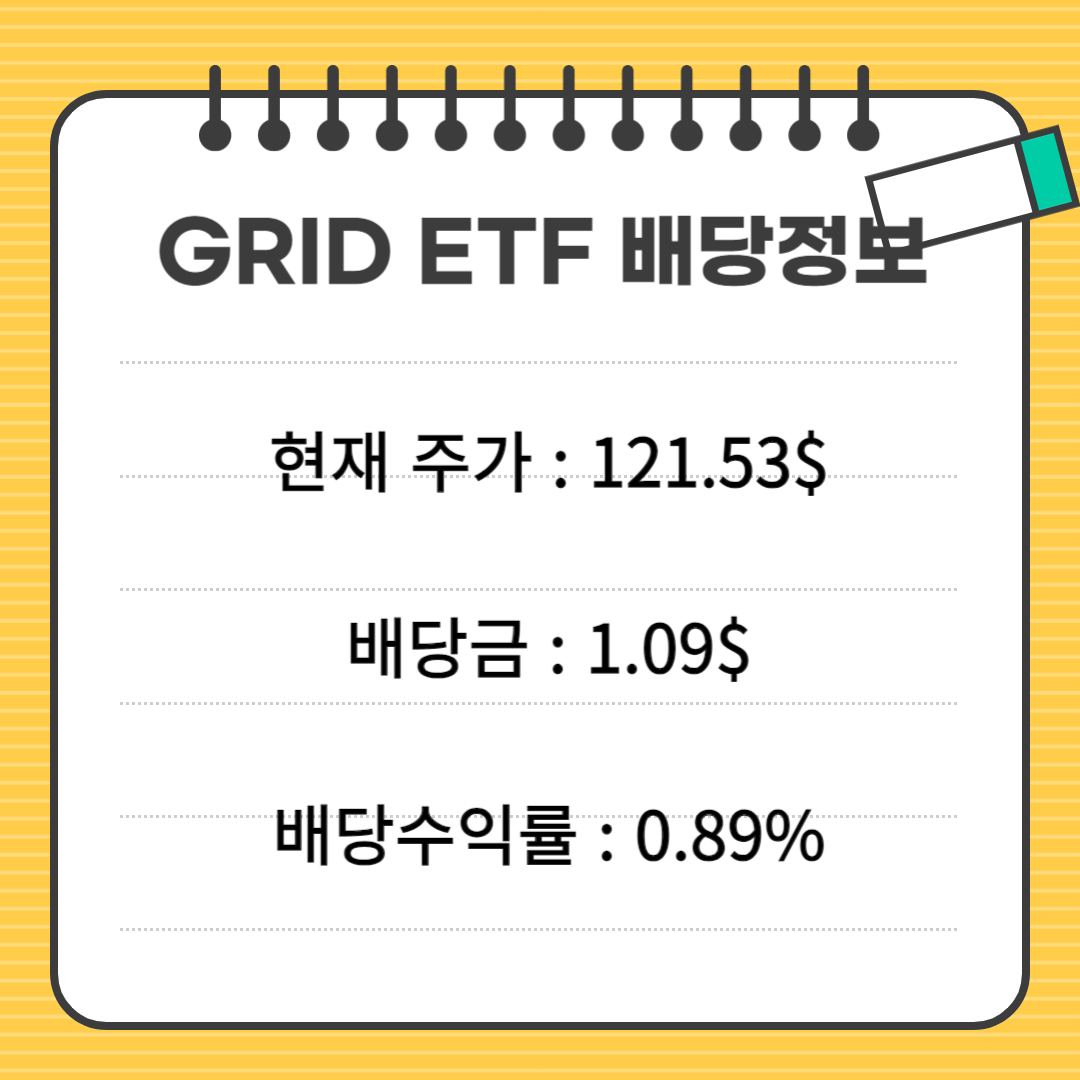 GRID ETF의 배당에 대해서도 알아보겠습니다. 현재 기준 1주당 121.53$이며, 배당금은 1.09$입니다. 배당수익률은 0.89%로 높지 않습니다.