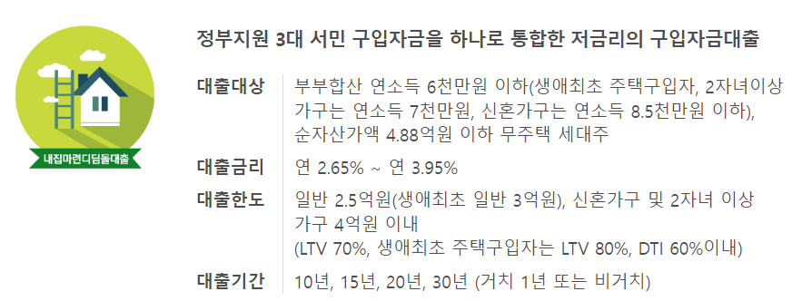 내 집마련 디딤돌 대출은 주택을 보유하지 않은 서민의 주택 구입을 지원하는 정부의 대출 상품입니다. 대출 금리는 연 2.65%~ 연 3.95%로 시중은행보다 낮기 때문에 자격에 해당된다면 받는 게 좋겠습니다.