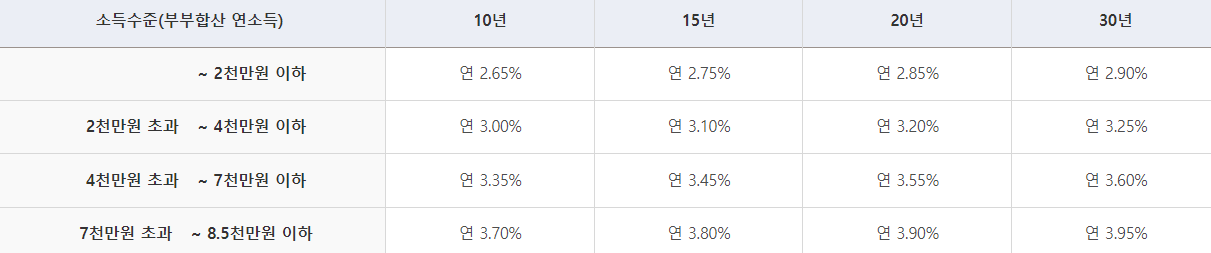 소득기준과 기간에 따라 달라지지만 연 2.65%에서 연 3.95% 정도의 금리를 나타내고 있습니다.